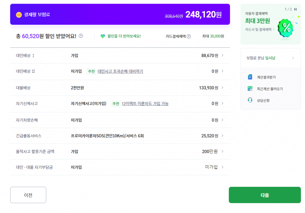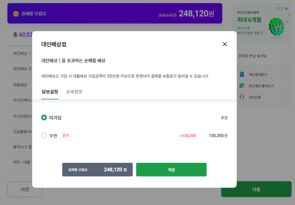 기존 대인배상1과 대물배상에서 대인배상2를 추가하겠습니다. 대인배상2를 추가로 가입하면 보험료는 15만원 더 추가가 됩니다.
